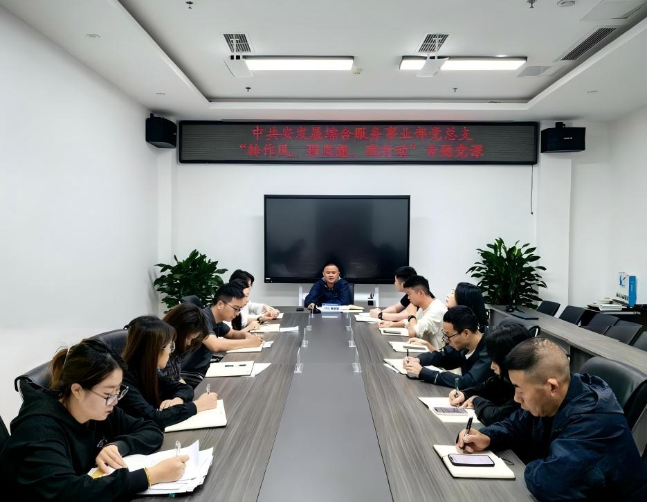2025年9月30日,综合服务事业部党总支组织召开“转作风、强思想、践行动”专题党课。集团党委副书记、工会主席赖园园应邀担任主讲,综合服务事业部党总支书记、总经理林子龙主持活动,事业部管理人员及全体党员参加学习。