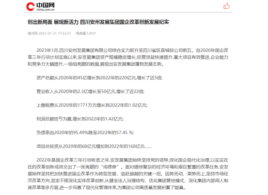 近期,《中国网》《国企网》以《创出新局面 展现新活力 四川betway必威国企改革创新发展纪实》为题,报道了国企改革三年行动以来,集团公司改革创新发展成果,并突破10000+的阅读量。