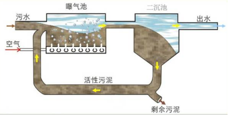 混合污水与富含微生物的活性污泥,在曝气中微生物利用有机物生长繁殖并降解。降解后,水经二沉池固液分离,上清液排出为处理水,沉淀污泥则返回曝气池继续降解,形成循环